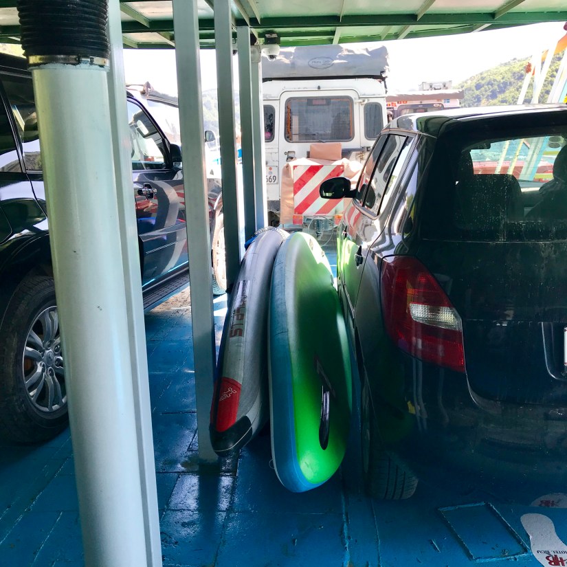 We reached our collection point at 1400ish and began the slightly nervous wait for our promised ferry pick up. But we needn’t have worried because sure enough, at 1420ish the ferry came into view and as we paddled out it slowed for us to board. It wasn’t a graceful scramble back onto the ferry, but bodies and boards were dragged up onto the deck and high fives shared as the joy of pulling off our little adventure sank in…