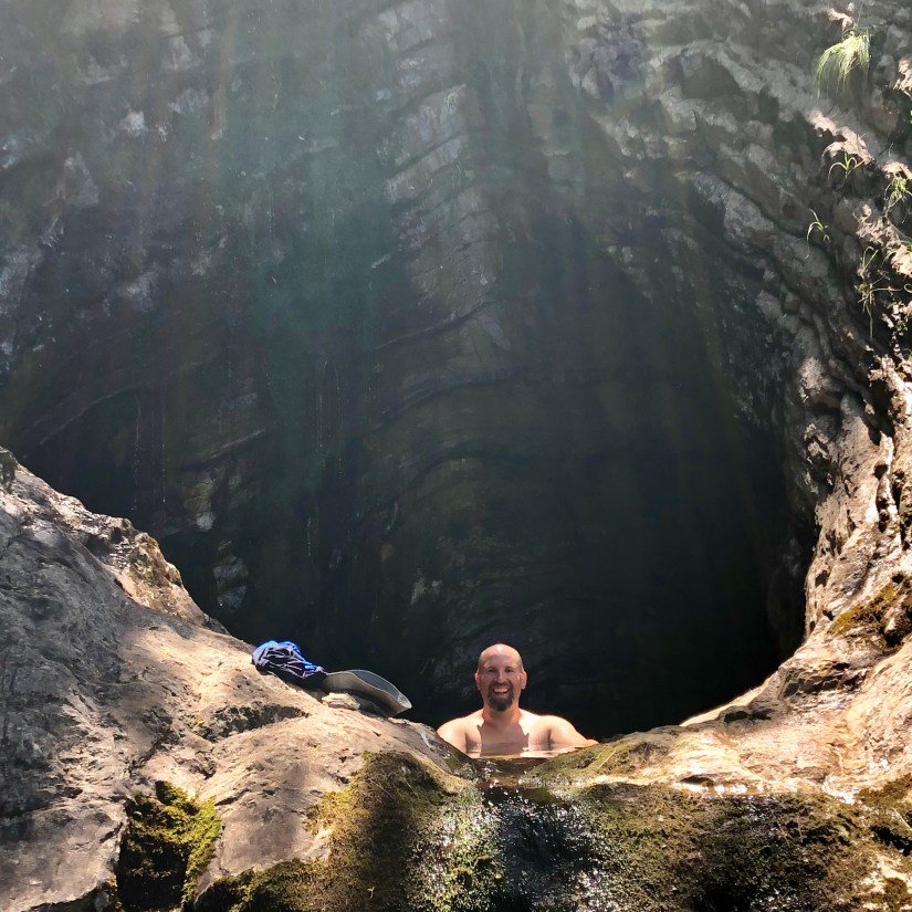 We stopped for lunch at the only lakeside establishment we’d seen, which was set up to host the occasional small boat load of tourists, then began the more arduous journey back to our rendezvous. The now headwind was fierce and there was a point when we became concerned that we had lingered too long at lunch, but we made steady progress. And then the wind dropped, as quickly as if somebody had turned off a fan, and we could relax for the last couple of kilometres, exploring coves and waterfalls and even taking a little dip!